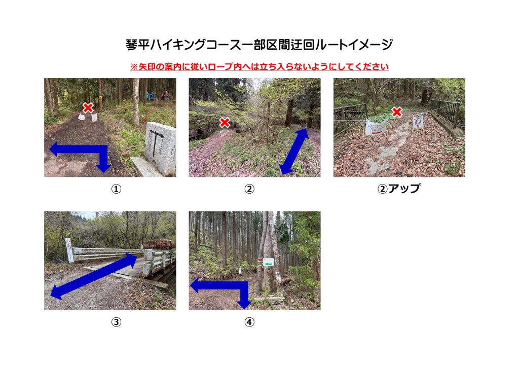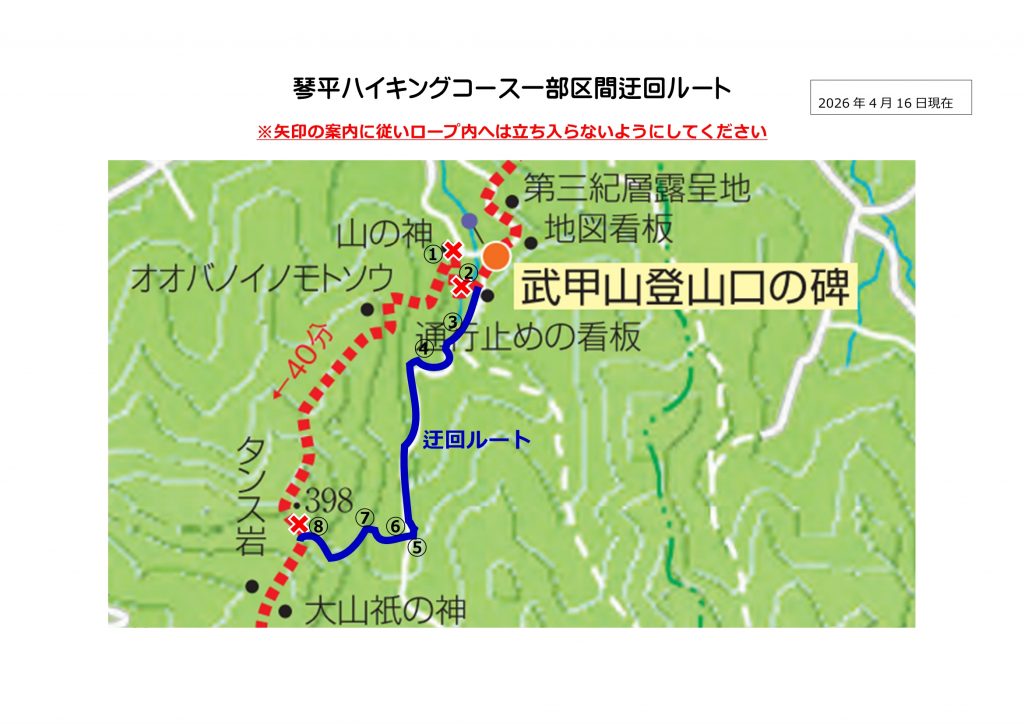 琴平ハイキングコース付近における搬出間伐に伴い重機がコース上で作業を行うため、下記期間中は琴平ハイキングコースの一部区間が通行ができなくなります。期間中は施工業者にて迂回看板を設置いたしますので、案内に従い迂回をお願いたします。ご利用される方々にはご迷惑をおかけいたしますが、何卒ご理解とご協力のほどよろしくお願いいたします。