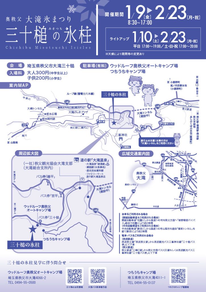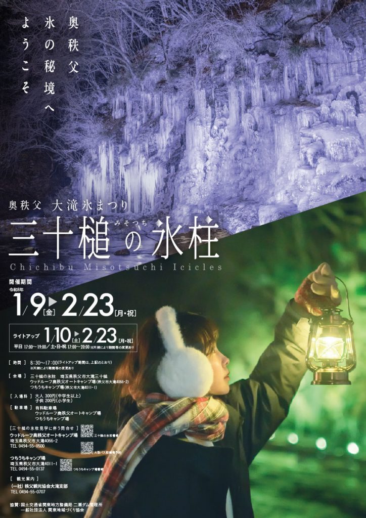 天候や氷柱の状態により変わる場合があります。詳しくは、令和8年1月9日(金)~令和8年2月23日(月・祝)は、ウッドルーフ奥秩父オートキャンプ場・つちうちキャンプ場、先述期間外は観光協会へお問い合わせください。