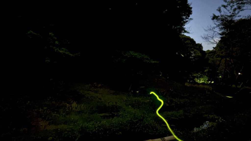 上町...今シーズンこれまでで一番多くのホタルの飛翔が見られました。蒸し暑く風がない絶好のホタル日和、かつ星空もきれいな夜でした!
