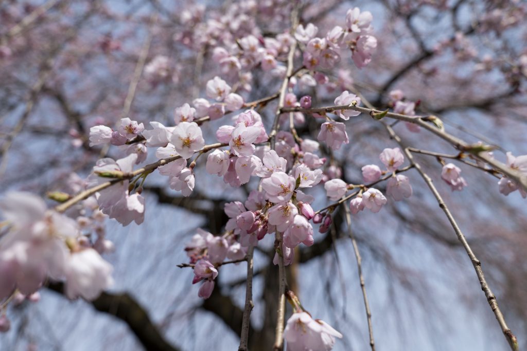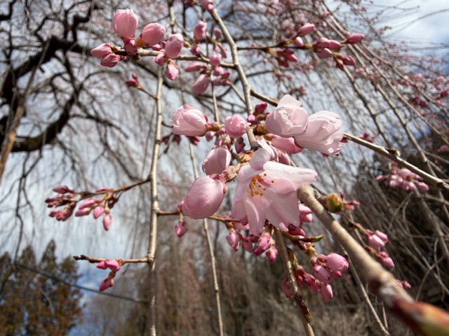 遅咲きのベニシダレ桜は本日開花しました。来週初めには見頃を迎えるでしょうか。