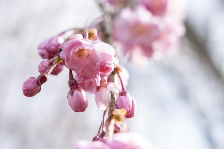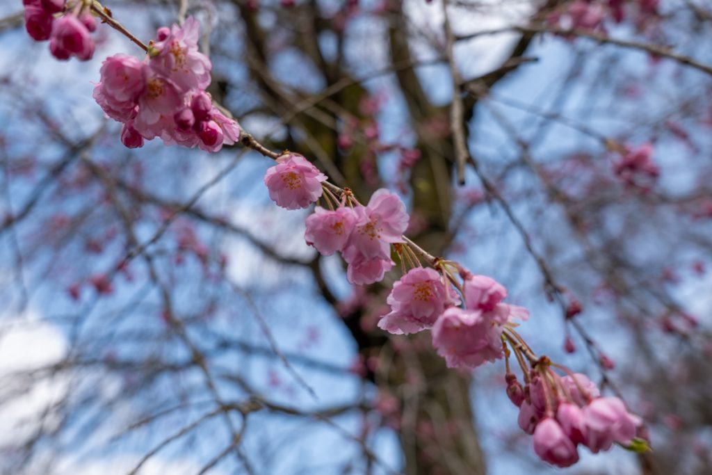 遅咲きのベニシダレ桜は2〜3分咲きです。