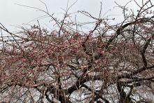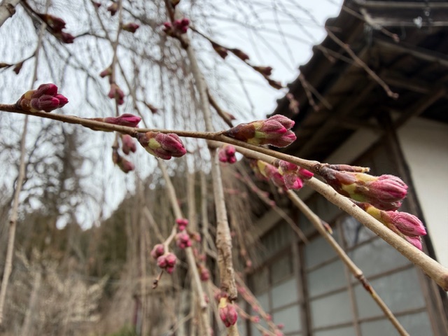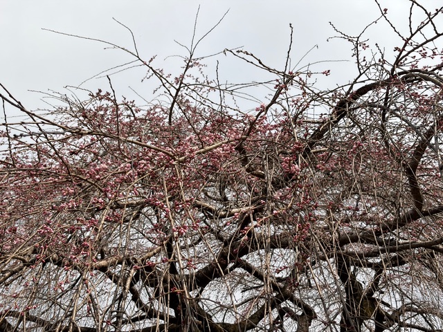 遅咲きのベニシダレ桜はまだ開花していませんが、蕾が膨らんできました。