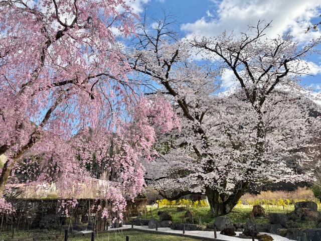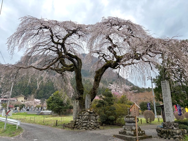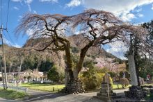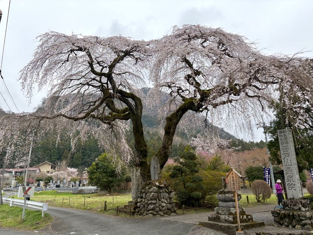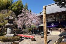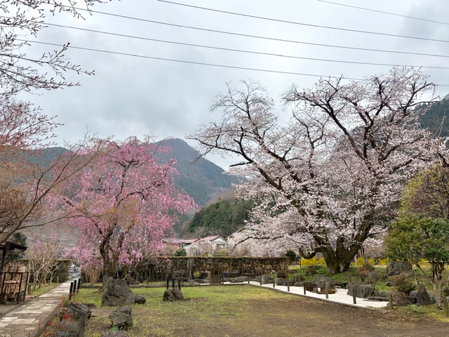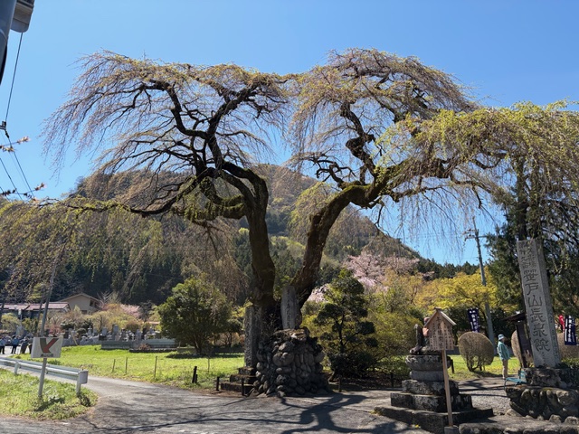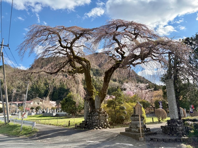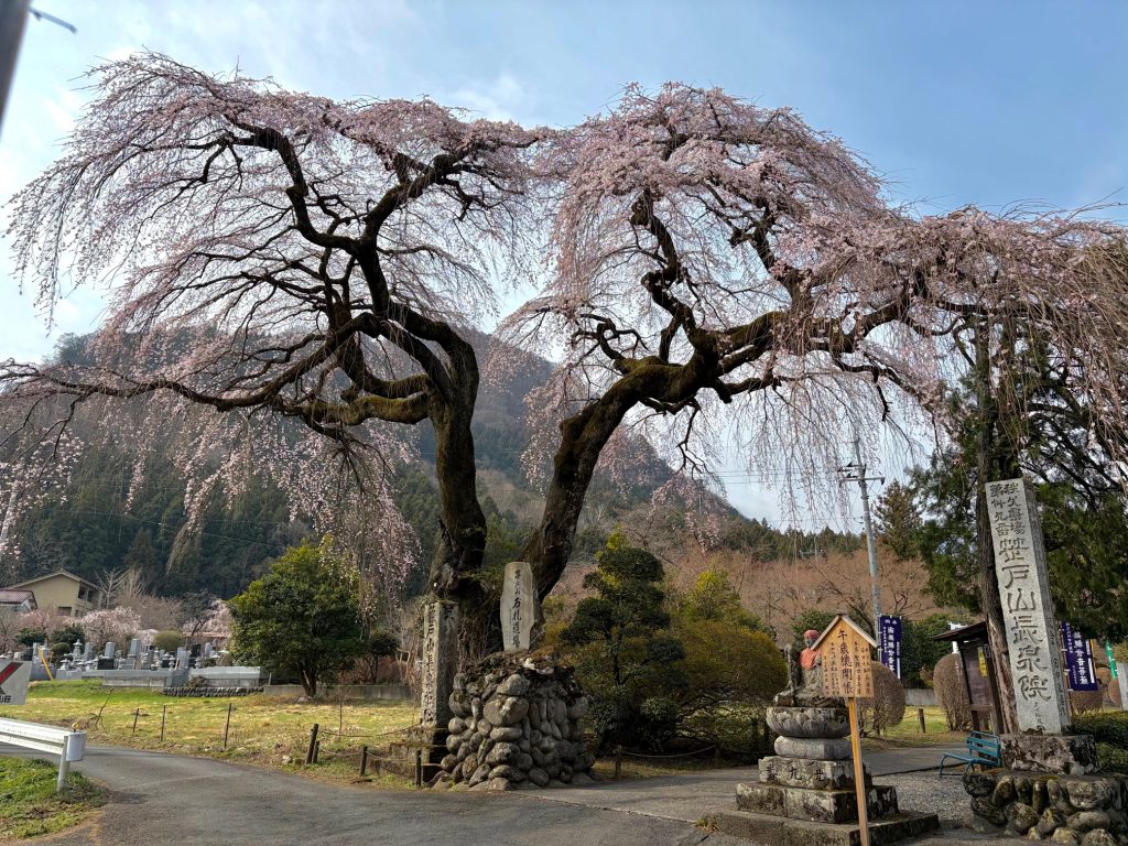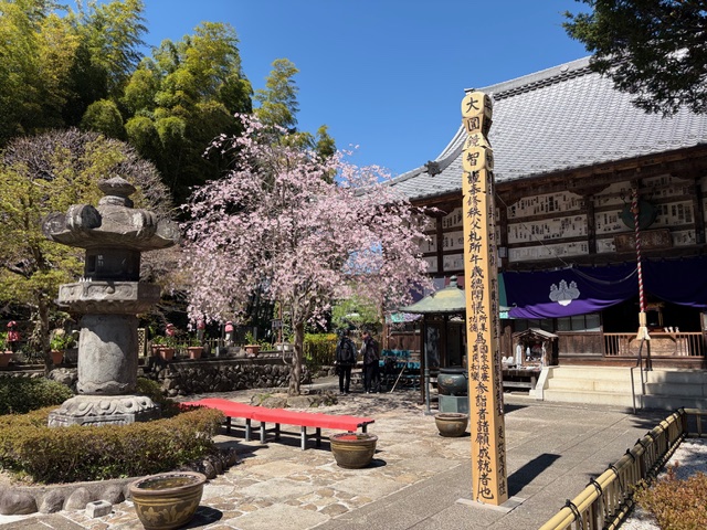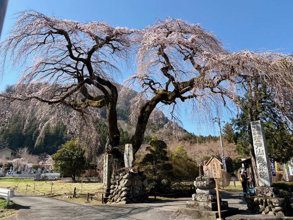 道路沿いのエドヒガン桜は引き続き見頃です。境内のベニシダレ桜も開花しました。