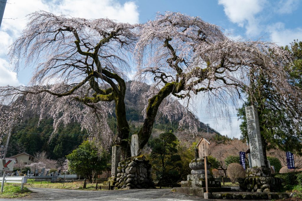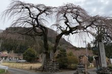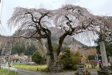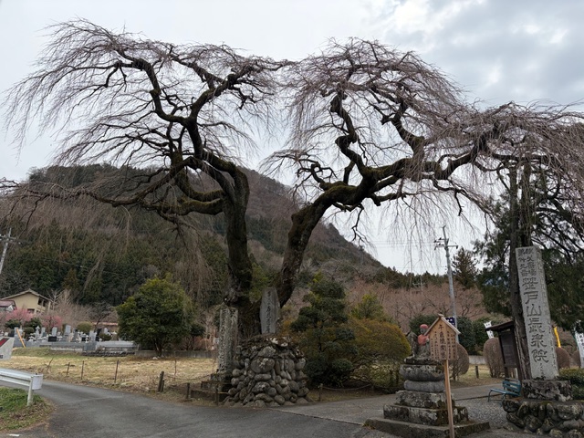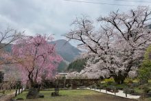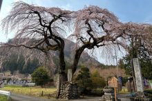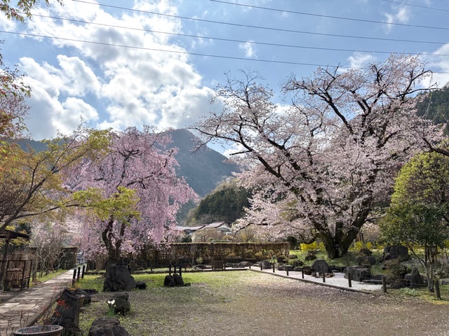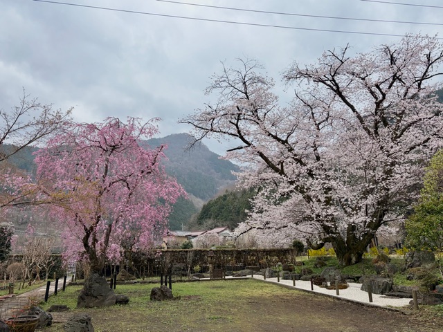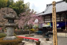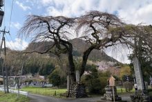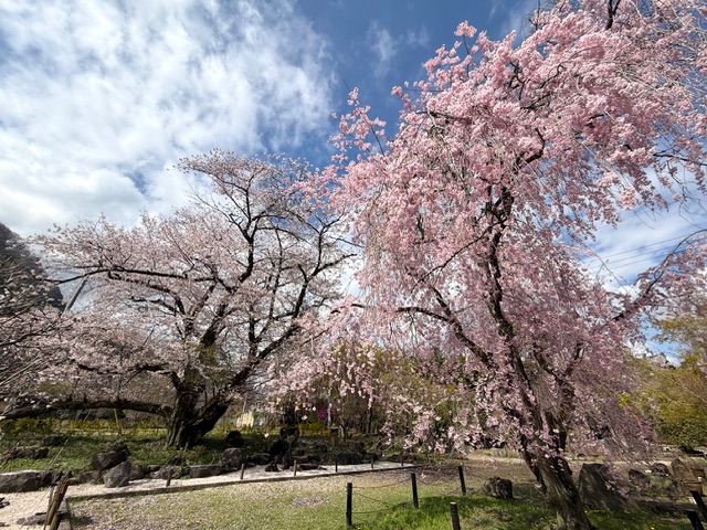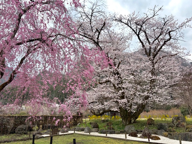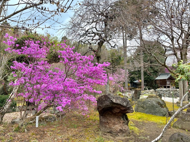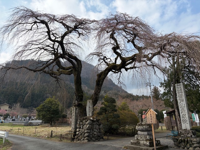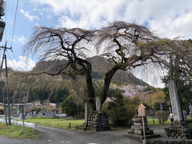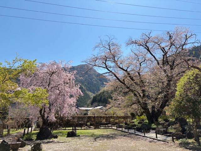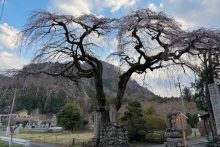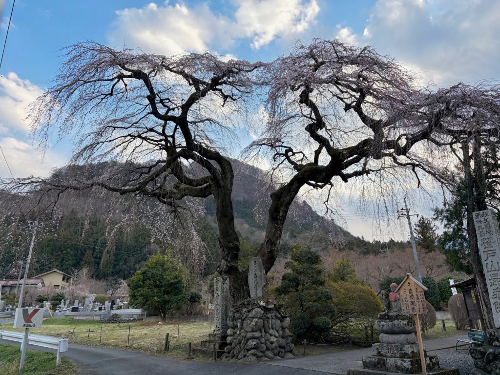 道路沿いのエドヒガン桜は引き続き見頃です。境内のベニシダレ桜も開花しました。