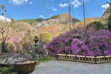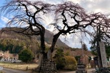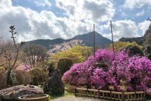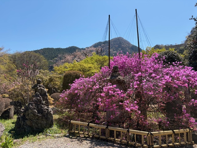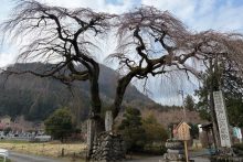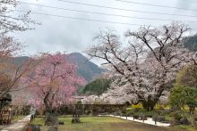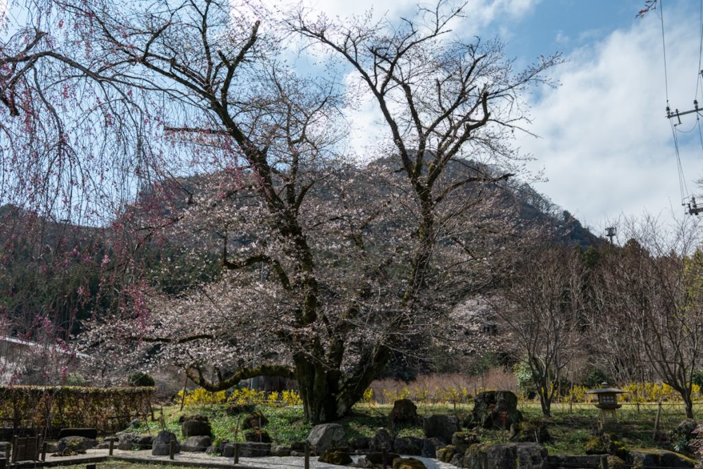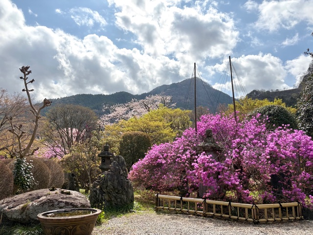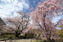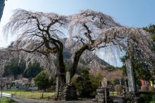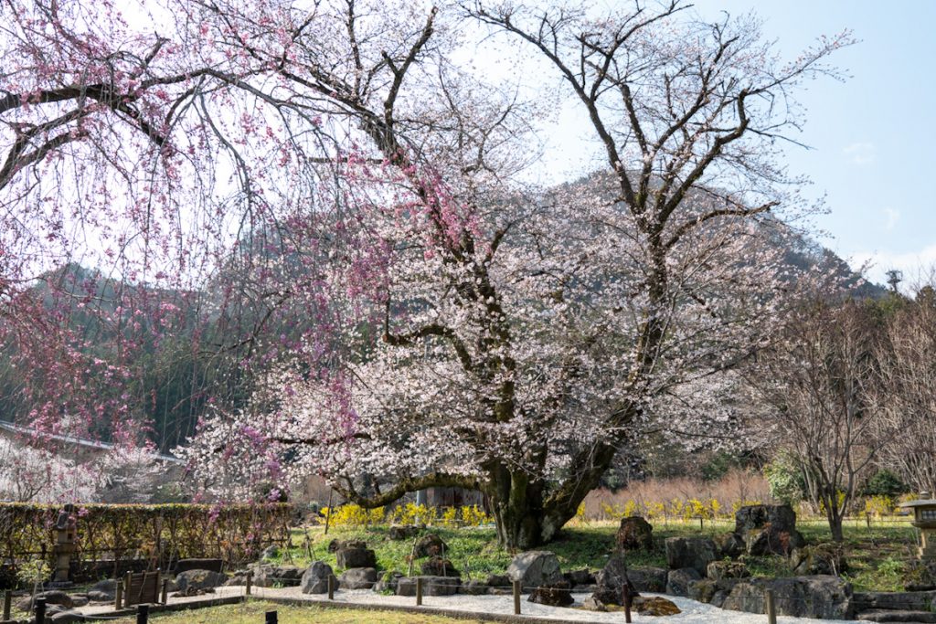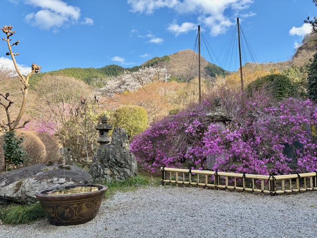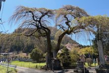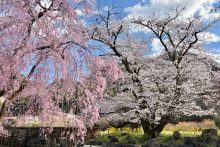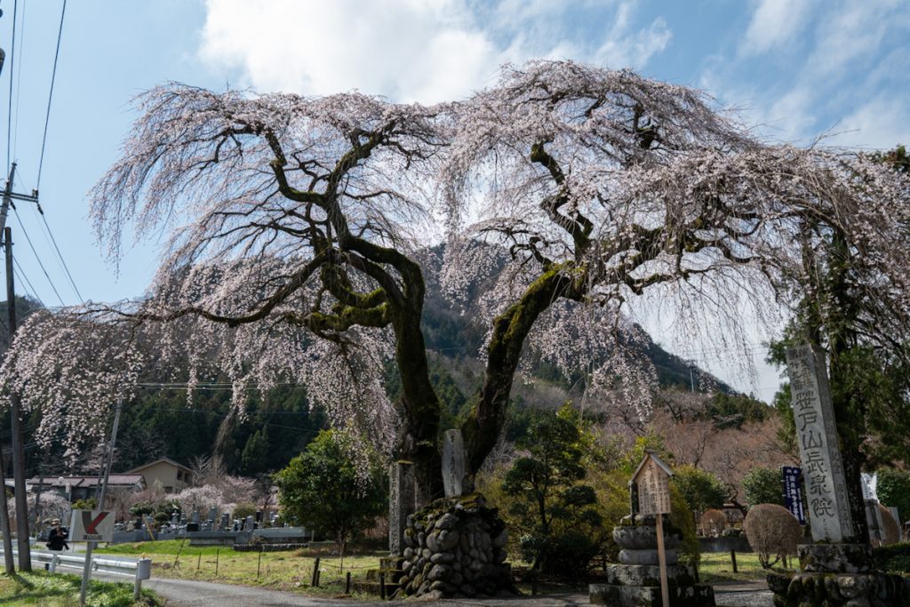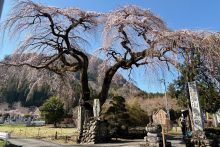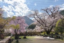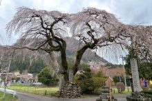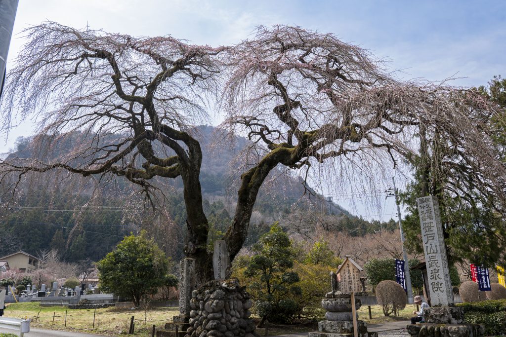 道路沿いのエドヒガン桜は引き続き見頃です。境内のベニシダレ桜も開花しました。